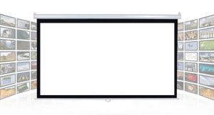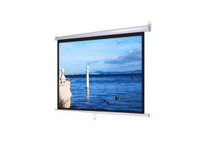 behind. - Wall-mounted projection screen with manual stop-and-adjust